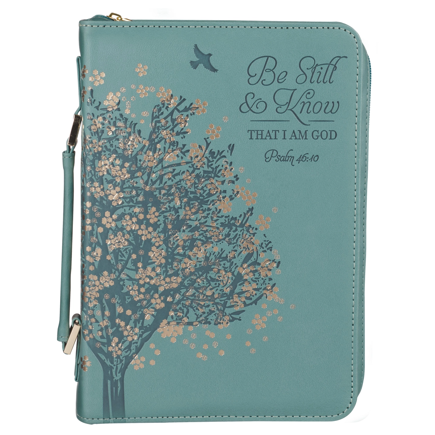 When your hands are already full with little ones, the Be Still and Know Teal Faux Leather Fashion Bible Cover is the perfect accessory to carry your Bible effortlessly and keep it protected from little hands, bumps, and moisture. Screen-printed tree design, Teal faux leather, Gold-foiled accents, Heat-debossed text, Be still and know that I am God, Psalm 46:10, Fashion Bible cover, Lay-flat carry handle, Gold metal hardware, Gold cross-engraved zipper pull, Exterior slip pocket, 2 interior elastic pen loops, 2 interior ribbon markers, Black ribbon for Old Testament, Red ribbon for New Testament
