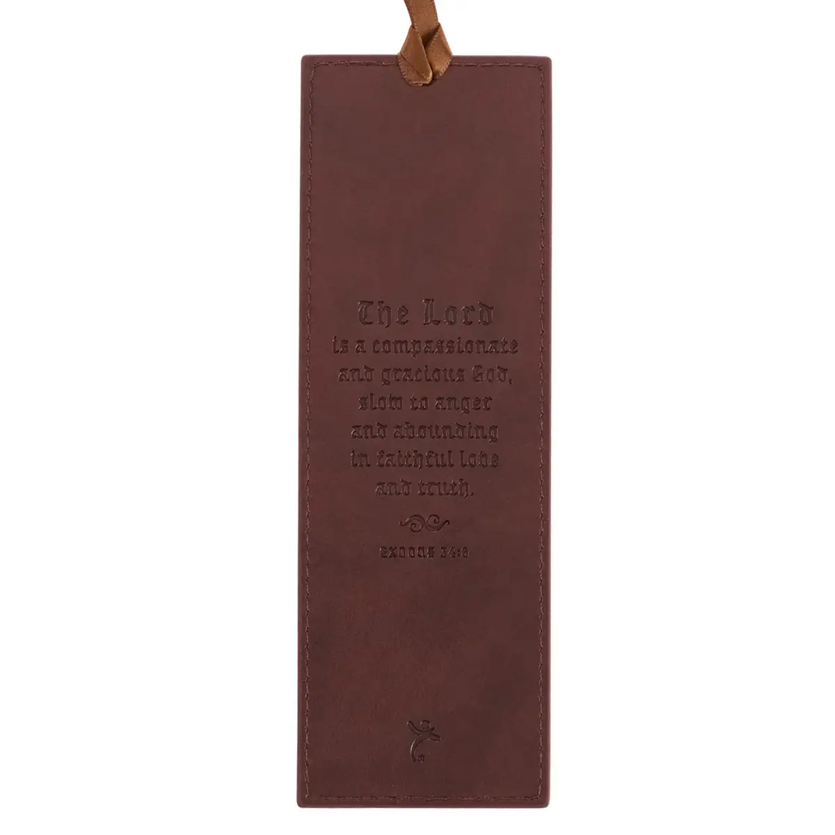 Heat-debossed into the smooth brown faux leather of the bookmark and printed in a gothic-style font are the names of God used throughout Scripture offered in English and Hebrew. Within a decorated heat-debossed diamond shape at the center sits God's statement from Exodus.I am who I am Brown topstitching borders the edges of this bookmark, and a light brown ribbon is tied at the top. The back of the bookmark is heat-debossed with a supporting verse from Exodus.The Lord is a compassionate and gracious God, slow to anger and abounding in faithful love and truth. Exodus 34:6